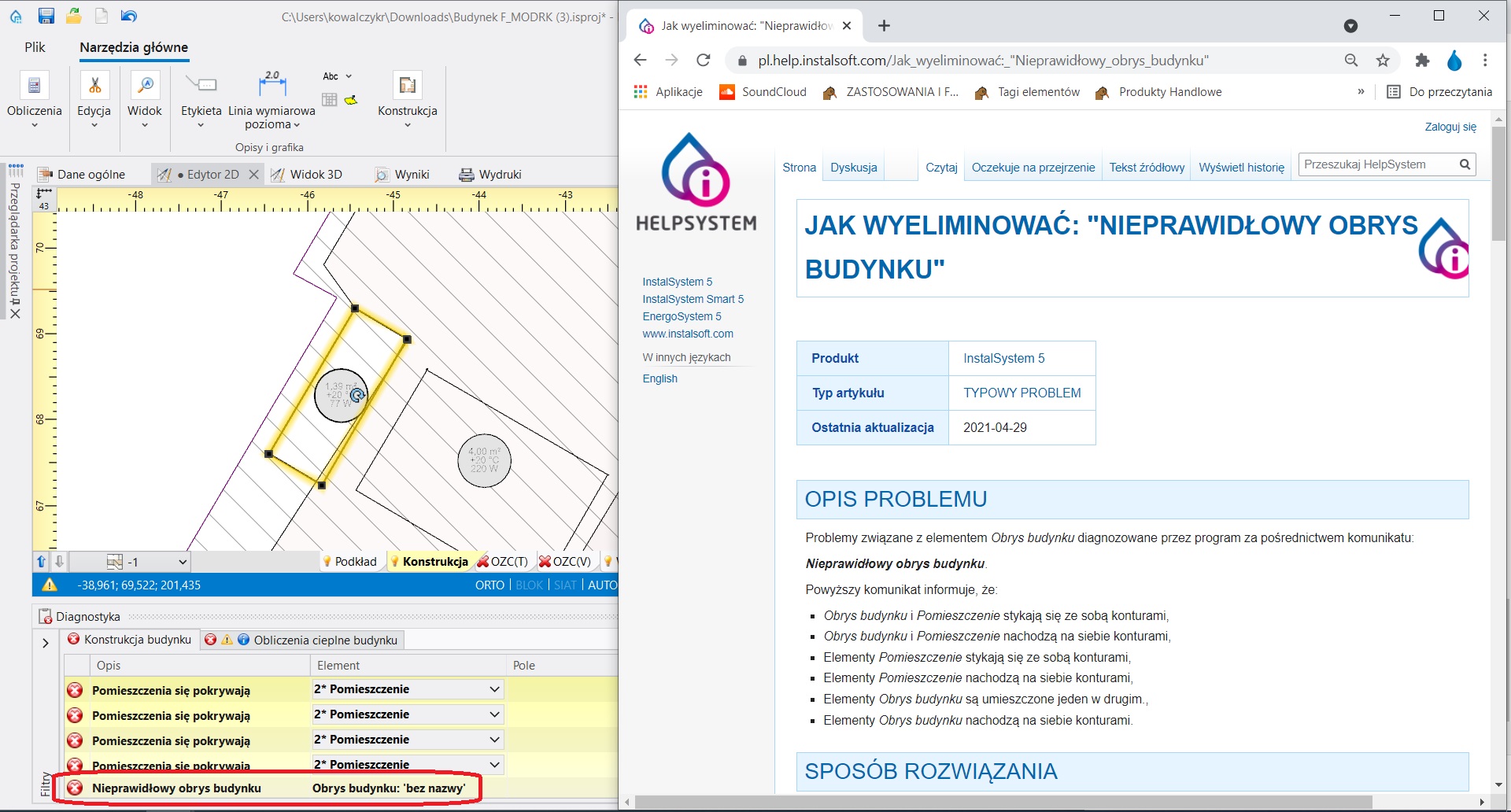 Dla diagnozowanych przez program częstych błędów i problemów projektowych podpięte są artykuły pomocy z platformy HelpSystem.